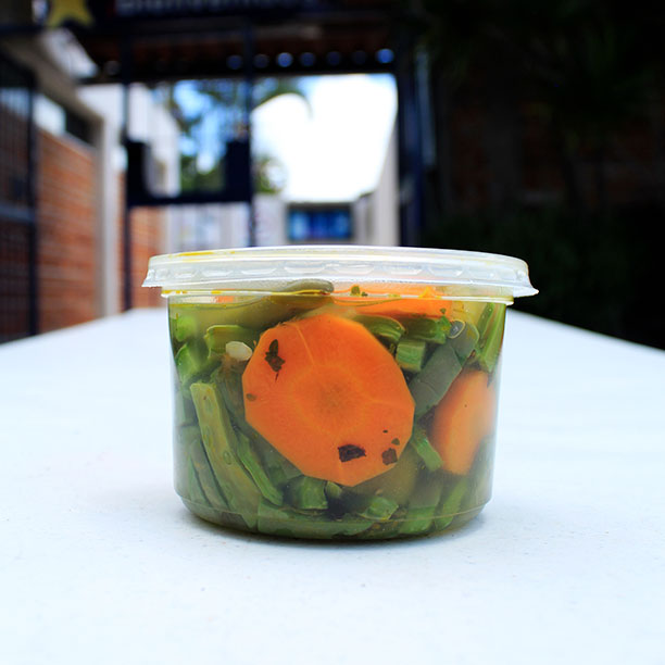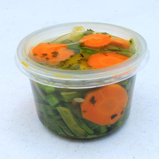 Mezcla de verduras con nopales frescos y especias en vinagreta.